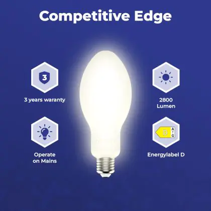 Met de aanschaf van deze LED HPL lamp met E27 (Dikke Fitting) fitting maak je een verantwoorde keuze. Deze LED variant is de zuinige vervanger van traditionele (HID) gasontladingslampen en is onder andere geschikt voor publieke ruimtes zoals bushokjes, parken, stations en parkeergarages. Ook kom je dit type LED gasontladingslamp tegen als verlichting voor straatlantaarns, magazijnen, fabrieken en winkels.