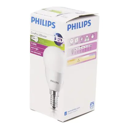 In ons assortiment E14 LED lampen valt er genoeg te kiezen. Vooral qua kleurtemperatuur (Kelvin) en vorm. Deze lamp heeft de volgende kleurtemperatuur: 2700K - Zeer Warm Wit. Hoe lager de kleurtemperatuur, hoe warmer het licht. Wil je ergens sfeer toevoegen? Kies dan voor een E14 LED lamp van 1800 tot 2700 Kelvin. Hoge kleurtemperaturen zoals 4000 en 6500 Kelvin zijn op hun beurt beter geschikt als functionele verlichting. De vorm van dit product is: Kogel. Op zoek naar een ander type E14 LED lamp? Gebruik dan het zoekfilter 'vorm' aan de linkerkant van deze pagina. Ook handig om te weten is de lichtopbrengst van deze lamp. Die is 470 lumen.